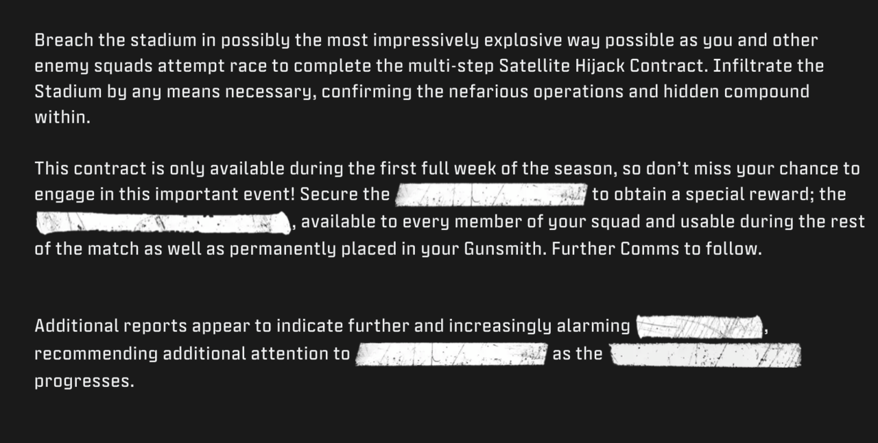 Players will also find a new contract called Satellite Hijack. The goal is to breach the stadium in the most explosive way possible. Details are limited since some of the mission info is redacted. There is also a mystery reward waiting for those who complete the challenge. The secrets around this contract are building up the suspense and making it one of the most exciting additions of the season.