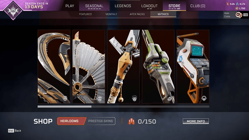 Lastly, there is the Mythic Store, where you can purchase high-end Prestige skins and the Heirloom melee weapons for your characters. Each character gets access to their own unique Heirloom skin, which can only be attained through exchanging Heirloom Shards. At the time of writing, the Bloodhound skin is available in the Store.
