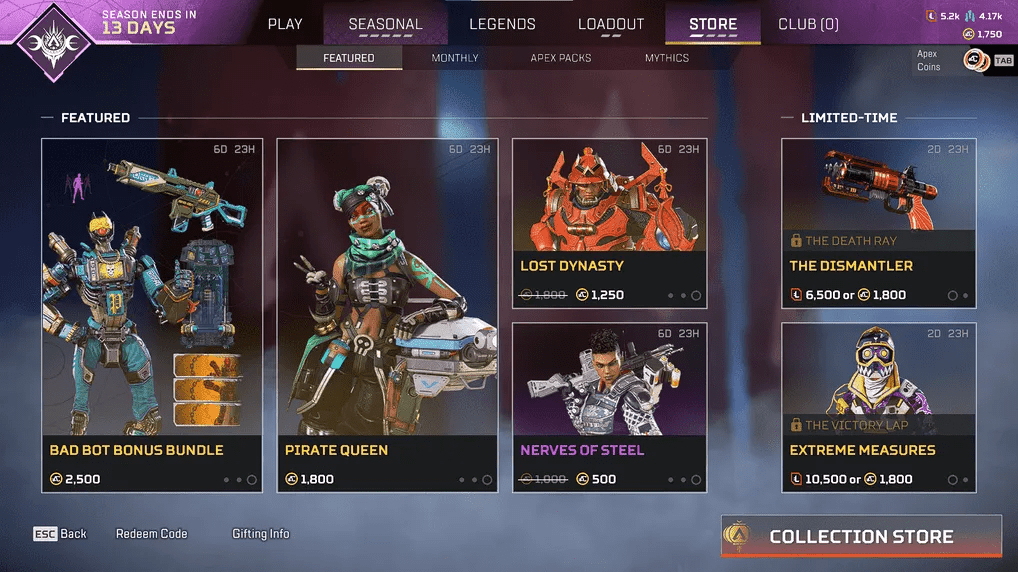 The Daily Shop, otherwise known as the Store, is a menu that you can access through the lobby. It allows you to purchase cosmetics by using Apex Coins, Legend Tokens, or Heirloom Shards. The Store also offers an alternative purchase method through the exchange of Apex Coins for items that can normally be crafted with Crafting Metals or found in Apex Packs. Finally, it also has Thematic Event items and Store-exclusive items.
