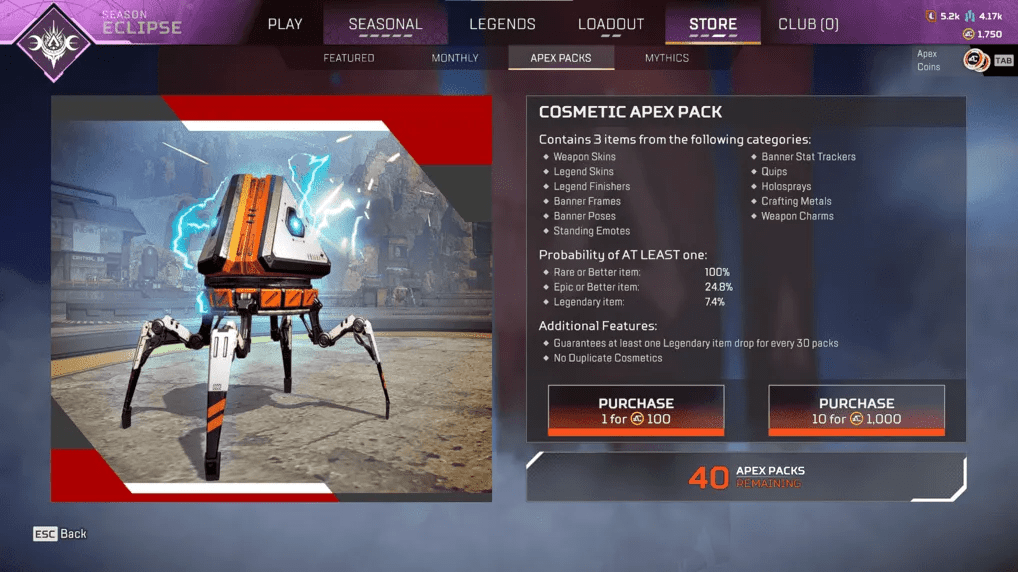 In the Item Pack section, you can purchase packs that essentially act as random loot crates. Opening a pack gives you 3 items, which have the potential to be the Legendary skin you’ve been wanting! However, that really depends on how lucky you are, so you also may not get anything you need or like.
