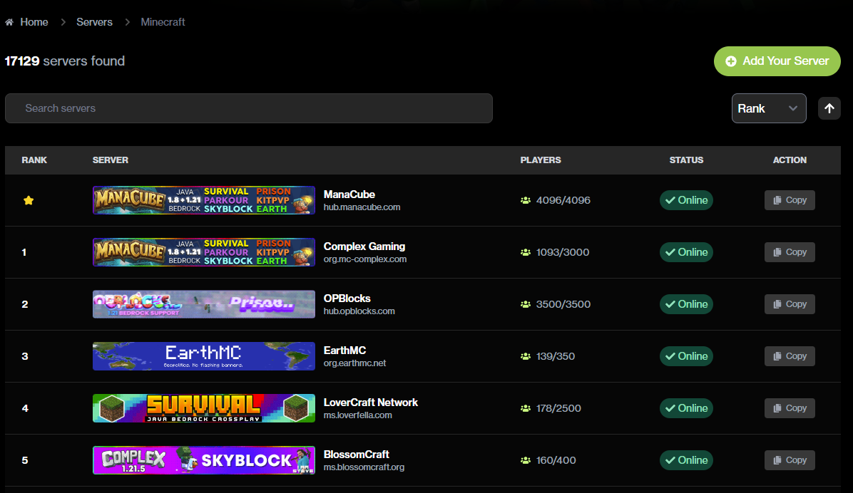 With over 17,000 Minecraft servers listed, it’s super easy to find a community that matches your vibe. Filter by name, popularity, or game type. See live player counts. Copy the server IP with a single click. Whether you want high-stakes PvP or chill building zones, it’s all here.